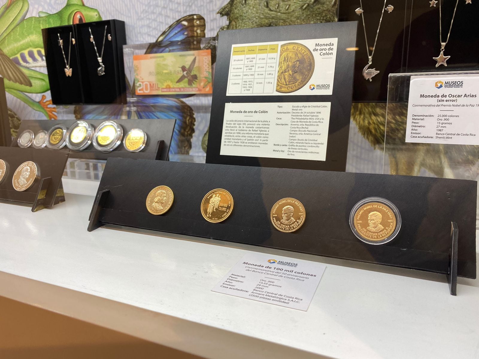 Actualmente, la moneda coleccionable en venta más costosa de la tienda de los Museos del Banco Central es de oro y posee la cara del expresidente Óscar Arias, pues se acuñó en conmemoración del Premio Nobel de la Paz que recibió en 1987. Su precio ronda los $1.500 (unos ¢963.000).