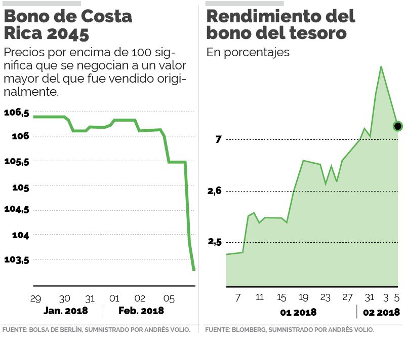 Los precios de los bonos costarricenses de deuda externa bajaron este lunes 5 de febrero en medio de un entorno de incertidumbre local e internacional, debido al resultado de las elecciones nacionales y al desplome del índice accionario Dow Jones en la Bolsa de Valores de Nueva York.