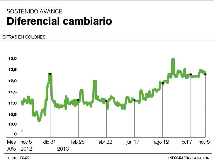 La brecha entre el tipo de cambio de compra y venta del dólar en el sistema financiero nacional, o diferencial cambiario, ha crecido lentamente desde junio desde cifras alrededor de los ¢11 hasta montos que rondan los ¢12,5.