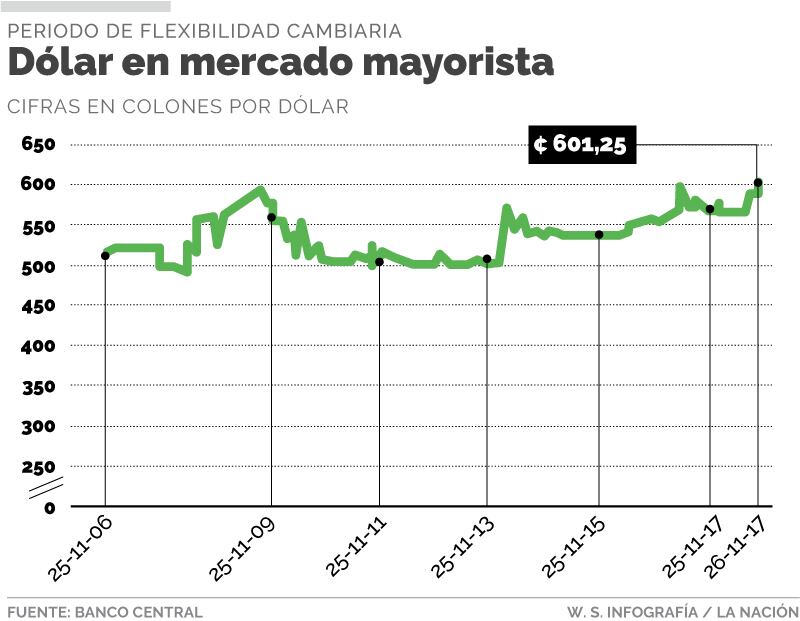 El precio del dólar en el mercado mayorista subió este viernes 26 de octubre por encima de los ¢600 por primera vez en el periodo de la flexibilización cambiaria, que inició en octubre del 2006.