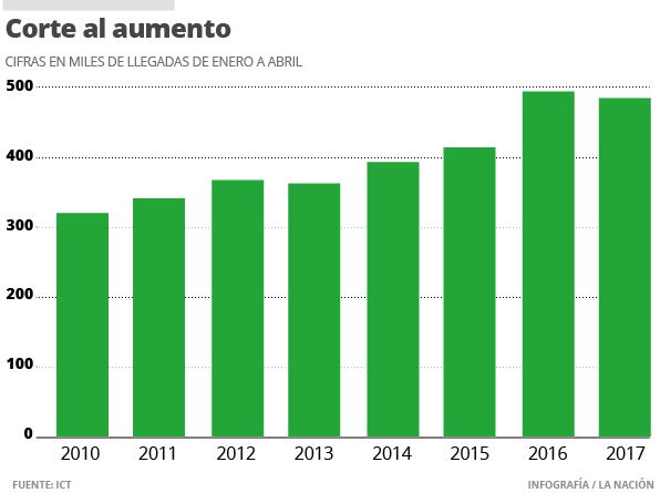 Entre el 2015 y el 2016, comparando los primeros cuatro meses, las llegadas de estadounidenses a Costa Rica subieron un 19%, de acuerdo con información obtenida de los informes estadísticos anuales del ICT. Al comparar el acumulado de enero-abril del 2015 con el 2014, el aumento fue del 5,5%.