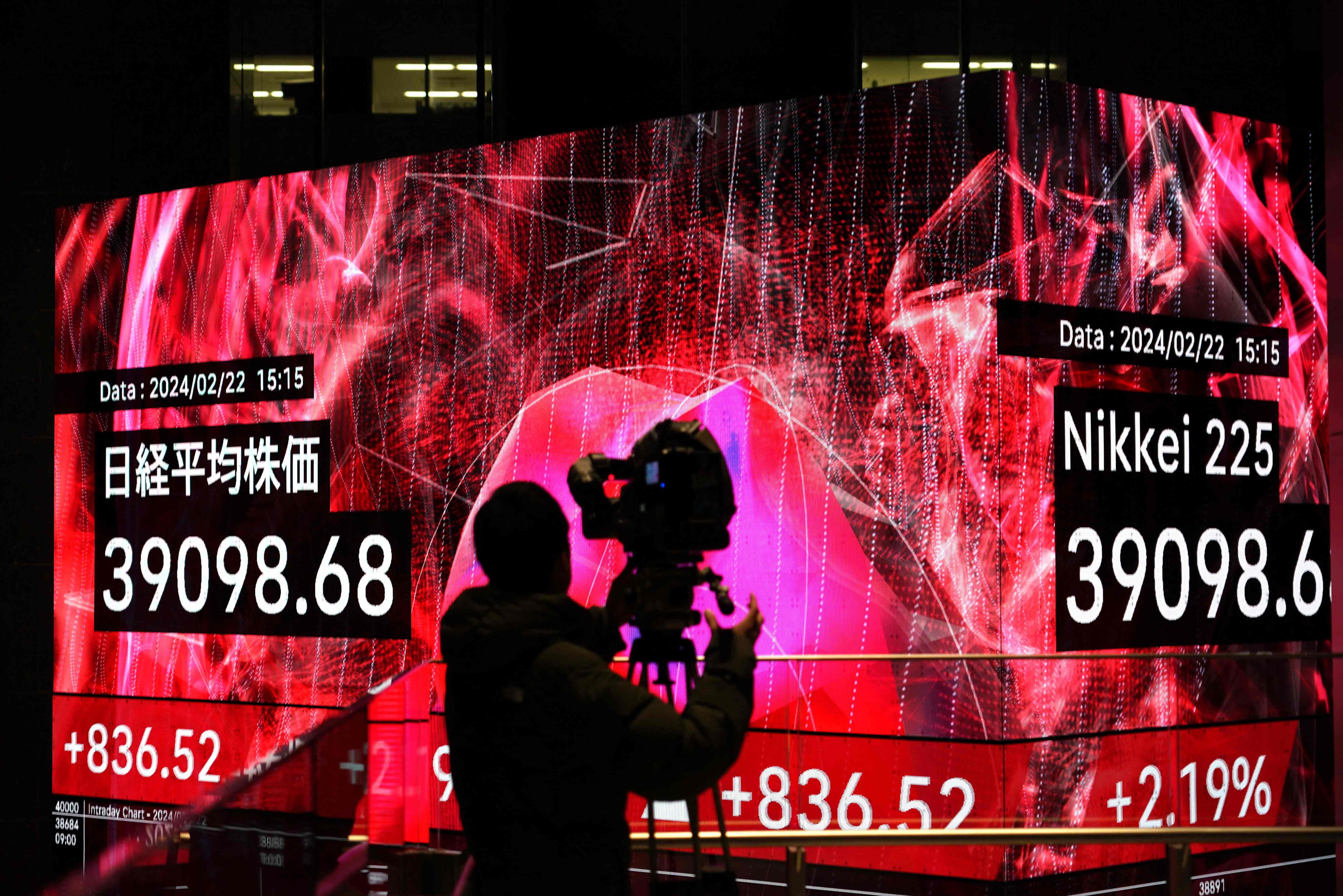 El Nikkei 225 terminó la sesión con 39.098,68 puntos, superando el récord previo de 38.915,87 puntos registrado el 29 de diciembre de 1989.