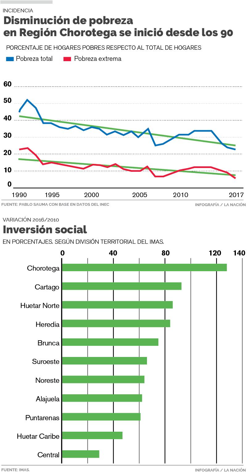 Según las consultas realizas a Sauma, a Natalia Morales, coordinadora del capítulo social del Estado de La Nación, y a Emilio Arias, presidente del Instituto Mixto de Ayuda de Social (IMAS), hay al menos tres factores que han influido en la región Chorotega: el cambio económico que impacta el mercado laboral de la región, la inversión pública y la ayuda estatal.