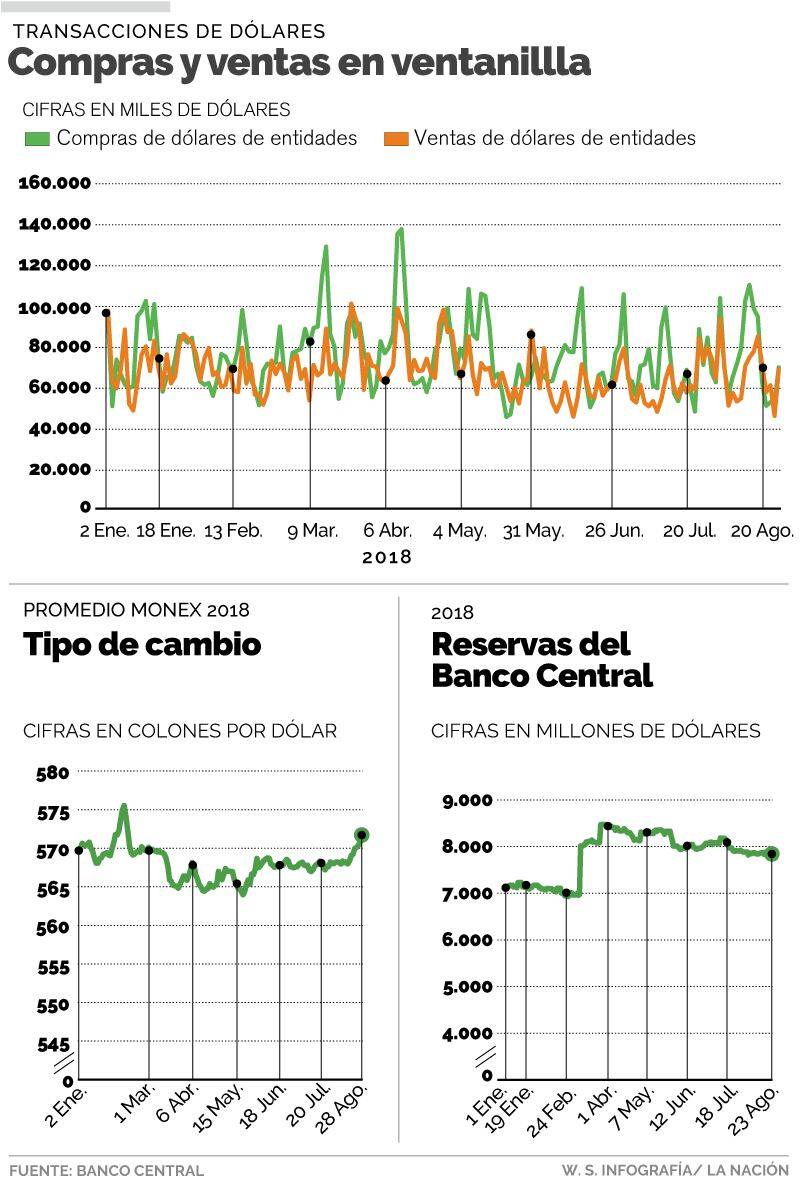 El aumento ya se refleja también en los precios que aplican las entidades en las ventanillas de los bancos al público. El precio de referencia de compra pasó de ¢564,08 el 17 de agosto (resultado del promedio de las transacciones del día anterior) a ¢566,09 el 29 de agosto. El de venta cambió de ¢570,12 a ¢ 573,18.