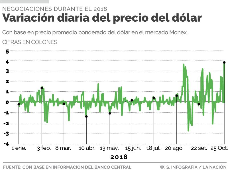 El precio promedio del dólar en el mercado Monex, donde se negocian montos superiores a $1.000, subió este lunes 29 de octubre ¢3,81, esta es la variación diaria más importante registrada este año.