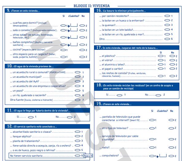 Así, en el segundo bloque, la persona censada deberá tener a la mano información como si la vivienda es alquilada, prestada o propia; el material del techo, el piso y las paredes así como su estado, de dónde provienen los servicios como el agua y la electricidad, tecnología con la que cuentan y tipo separación de los residuos que se realiza. Algunas consultas en este segundo bloque son: