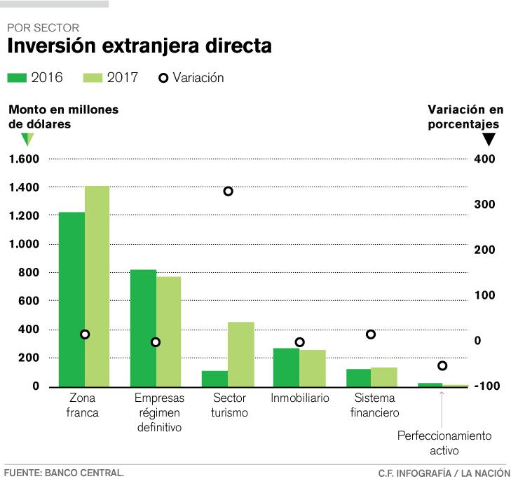 De acuerdo con los datos del Banco Central, la inversión directa en zona franca y en el sistema financiero también registró un crecimiento, en el 2017, aunque más moderado; mientras que en empresas del régimen definitivo, inmobiliario y perfeccionamiento activo hubo una caída.