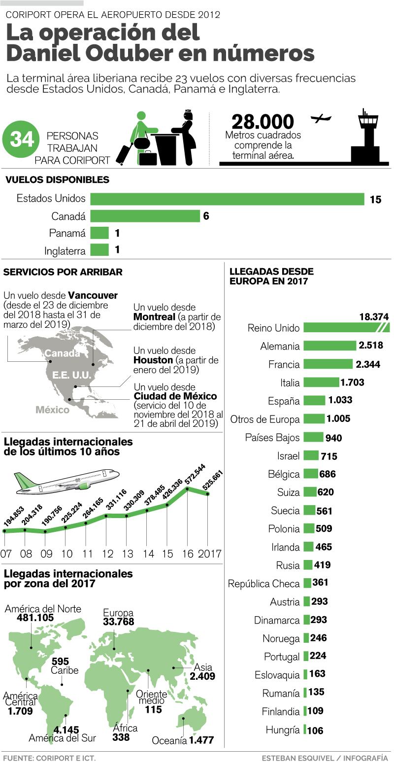 La apertura de vuelos procedentes desde el Viejo Continente es trascendental debido a que la terminal liberiana depende en su gran mayoría del mercado norteamericano. De las 525.661 llegadas internacionales registradas en el 2017, 91% provenían de Estados Unidos, Canadá y México.