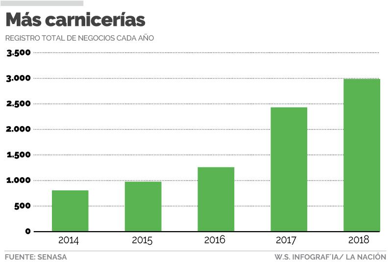 En tanto, la cantidad de negocios registrados oficialmente para comercializar carnes al menudeo se incrementó en un 270% entre el 2014 y el 2018, de acuerdo con datos solicitados al Senasa. En el 2014 el registro oficial tenía a 806 negocios y de ahí comenzó a subir hasta ascender a 2.986 puntos de venta en el 2018, detalló Minor Cordero, director de la Dirección de Operaciones del Senasa.