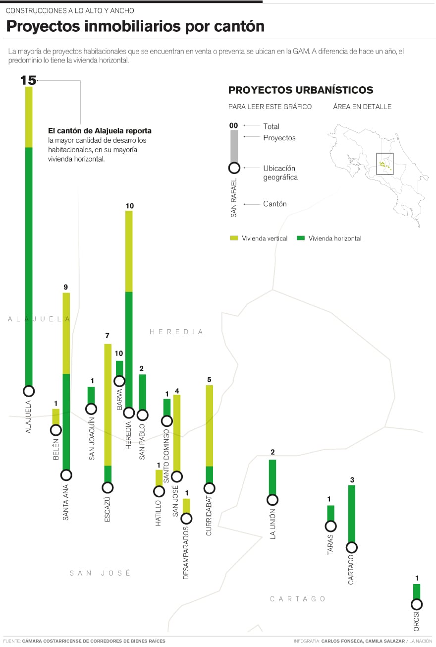 En cuanto a la ubicación, los cantones de Alajuela, Heredia y Santa Ana registraron la mayoría de obras de construcción, con 15, 10 y nueve proyectos, respectivamente. Además, en Escazú se encontraron siete desarrollos, de los cuales seis eran condominios verticales.
