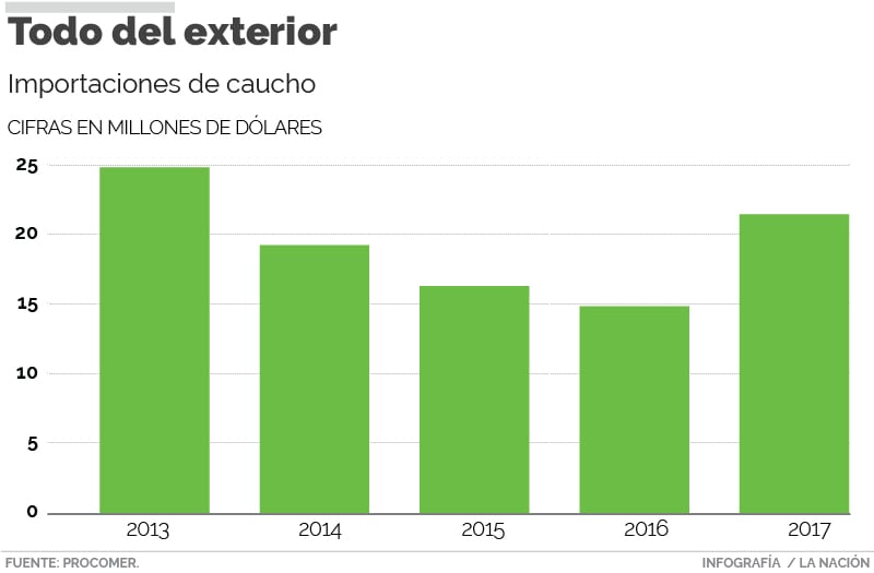 Juan Fernando Letona, socio fundador de Hevea CR Desarrollo Forestales, explicó que Costa Rica importa la totalidad del caucho que necesita, volumen que se estima en unas 10.880 toneladas anuales.
