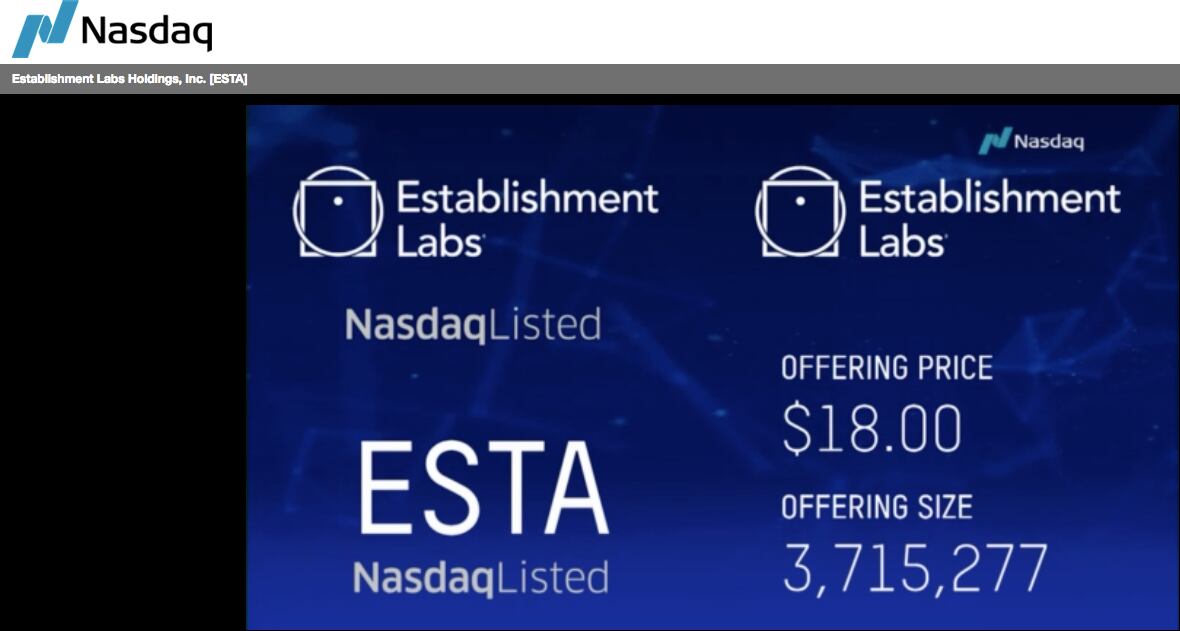 Nasdaq publicó un comunicado de prensa en el cual informa que el precio de la oferta pública inicial de 3.715.277 acciones ordinarias de Establishment Labs es a un precio de oferta pública de $18 por acción.