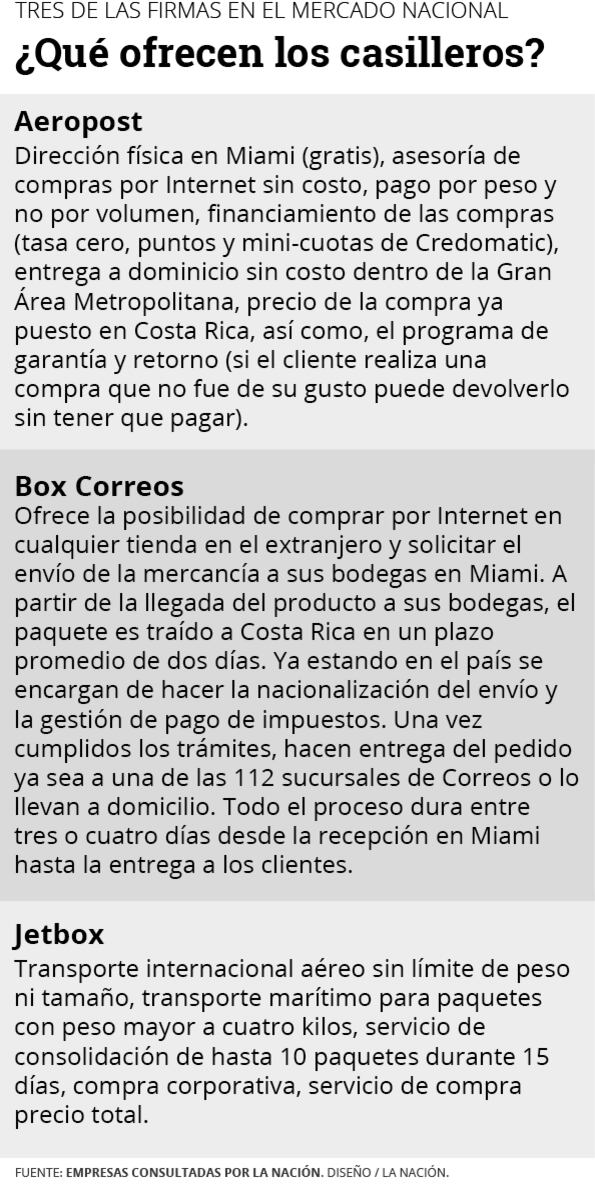Box Correos (Correos de Costa Rica), Aeropost y Jetbox aseguraron que tuvieron aumentos anuales de entre 12% y 35% en el número de paquetes que trasladaron, en los últimos tres años, y prevén que esta tendencia continúe.