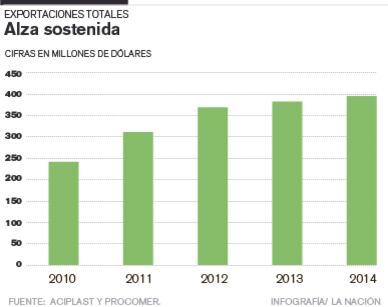 El valor total de las exportaciones pasó de $240 millones en el 2010 a $394 millones el año pasado, un 3,5% de las ventas del país, según la Asociación Costarricense de la Industria Plástica (Aciplast), con datos de la Promotora del Comercio Exterior (Procomer). El alza fue del 64%.