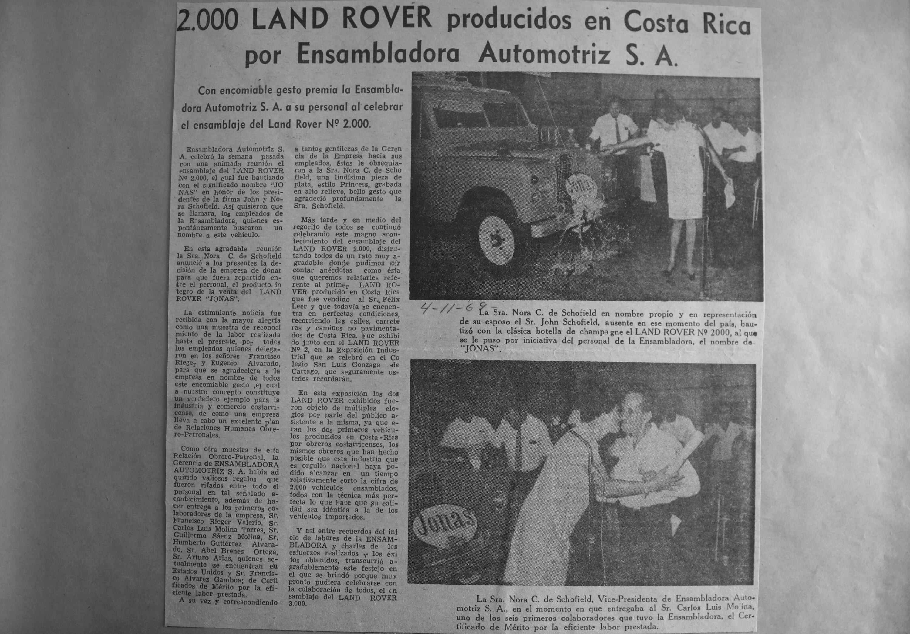 “Trabajábamos muy duro hasta la noche. En ese tiempo éramos muy poquitos habitantes en Costa Rica, pero no sé por qué tuvimos tanta suerte con el Land Rover, todo mundo se volvió loco y yo más, por supuesto. Íbamos a todas partes del país y la gente quedaba maravilla, nos querían dar dinero para que les guardáramos uno”, mencionó doña Nora.