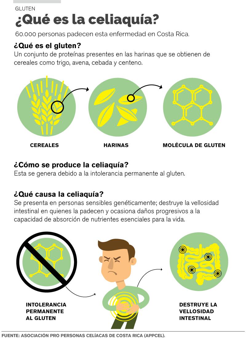 "La enfermedad celiaca es una intolerancia frente al gluten, se presenta en personas sensibles genéticamente y destruye la vellosidad intestinal en quienes la padecen, dañando progresivamente la capacidad absorción de nutrientes esenciales para la vida", explicó Ana Lorena Cordero, presidenta de la Asociación Pro Personas Celíacas de Costa Rica (Appcel).