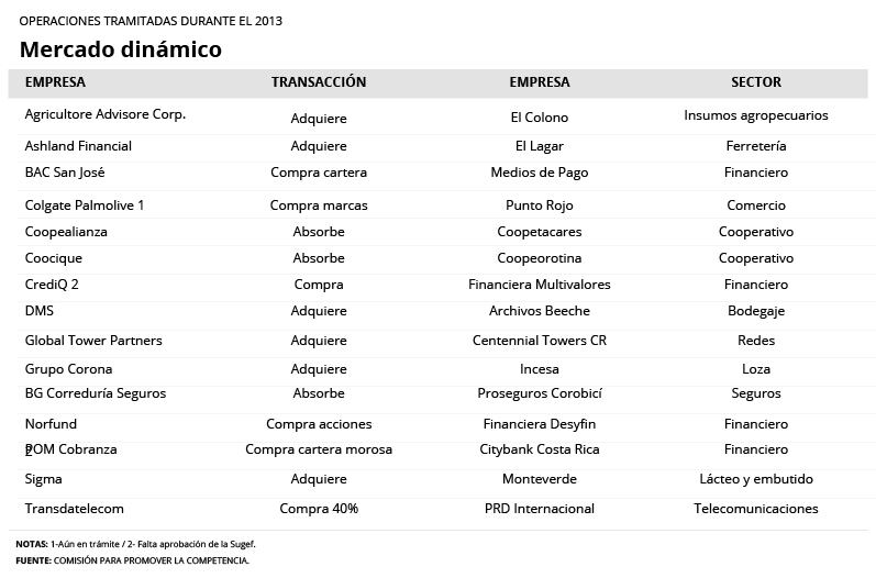Casos. Entre las transacciones están la absorción de Coopeorotina por parte de Coocique y de Coopetacares por parte de Coopealianza. También hay casos de compras de empresas comerciales.