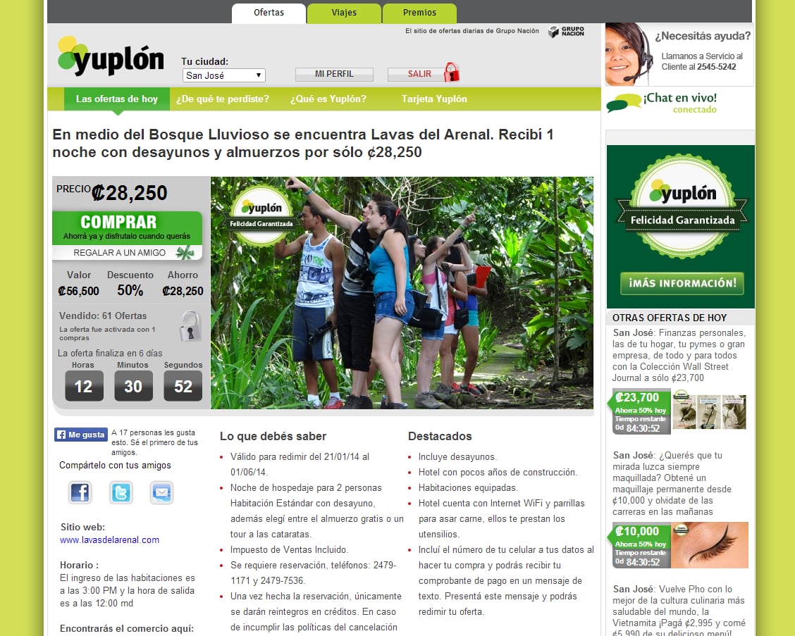 A manera de intermediario, Yuplón ofrece diariamente descuentos y promociones en restaurantes, spas, actividades, deportes, turismo y aventura en Costa Rica, entre otros. A la fecha más de 1.000 comercios participan a través de esta plataforma de compra.