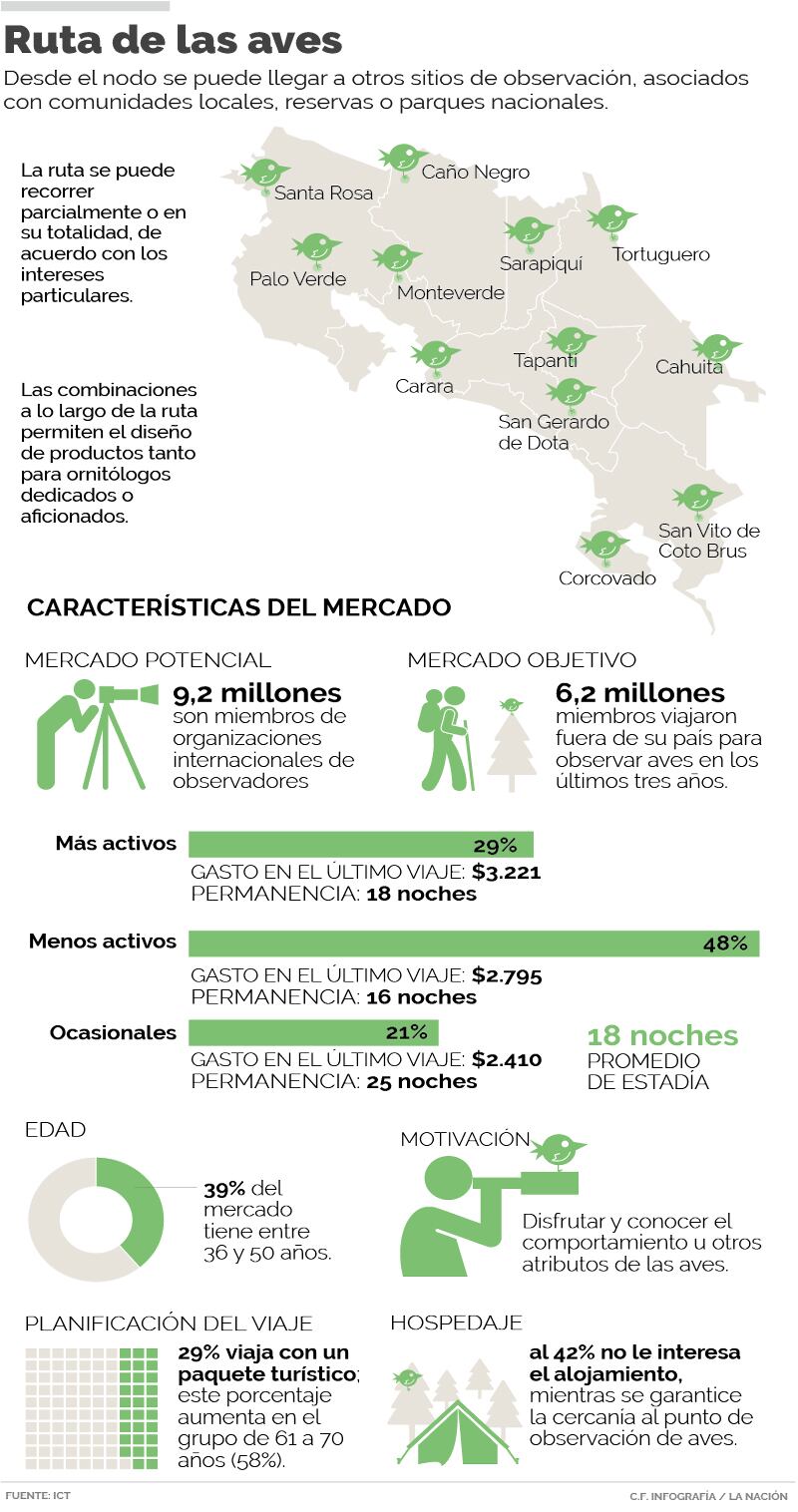 La ruta sugiere 12 nodos o puntos estratégicos para la observación de aves, compuestos por comunidades y zonas protegidas. Rodolfo Lizano, director de Gestión y Planeamiento del ICT, afirma que en esta etapa del desarrollo, el trabajo se concentra en mejorar las condiciones para los encadenamientos turísticos.