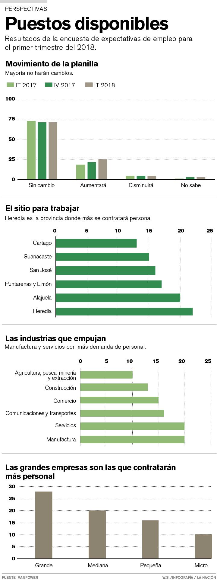 Según Manpower los aumentos de puestos se producirán en manufactura y servicios, especialmente, así como en empresas grandes. Geográficamente, el crecimiento de planillas se concentrará en firmas ubicadas en Heredia y Alajuela, precisamente donde se encuentras varios parques empresariales con compañías de servicios y manufactura externas.