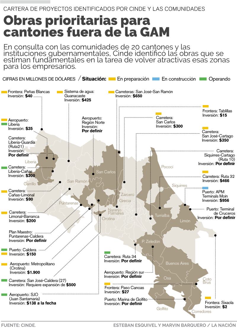 Una selección de 26 proyectos, entre los cuales están carreteras, aeropuertos, puestos fronterizos y hasta abastecimiento de agua, son fundamentales para llevar la inversión extranjera directa (IED) a 20 cantones ubicados fuera de la Gran Área Metropolitana (GAM), de acuerdo con un mapeo y selección de la Coalición Costarricense de Iniciativas de Desarrollo (Cinde).