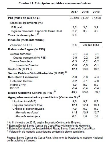 Pese al alto déficit fiscal la entidad prevé que el crecimiento económico aumentará al pasar de un 3,2%, en el 2017, a un 3,6% en el 2018, y a un 3,9% en el 2019 y el crédito al sector privado pasaría de crecer un 7% en el 2017, a un 6,9% en el 2018 y un 8,2% en el 2019. Los préstamos en dólares casi no aumentarían.