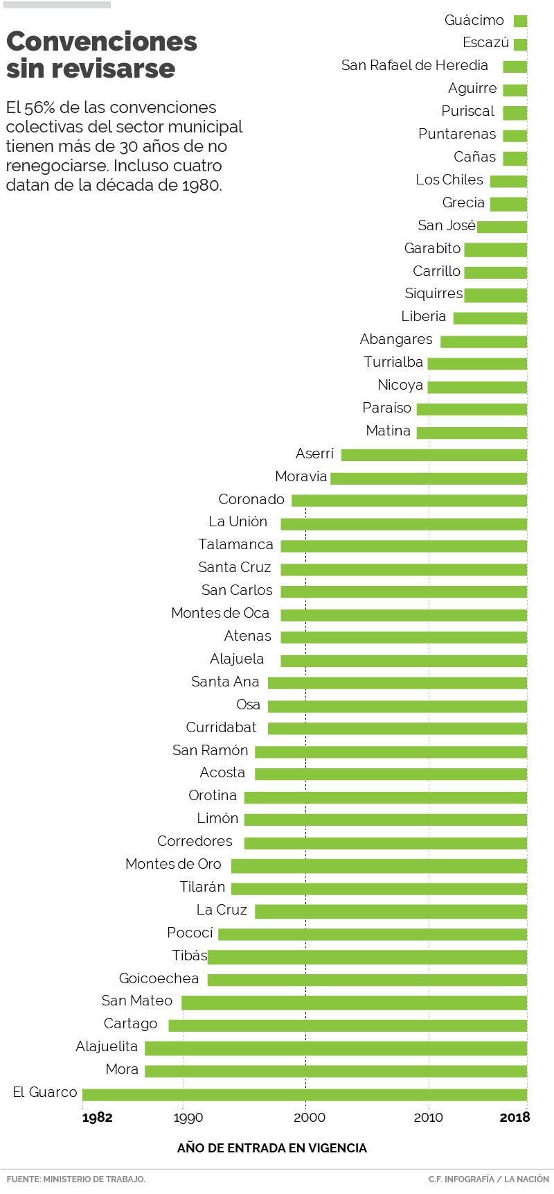 La convención colectiva del ayuntamiento de El Guarco, en Cartago, tiene 36 años sin revisarse. El acuerdo entre los trabajadores y el municipio comenzó a regir en 1982, según el Ministerio de Trabajo.