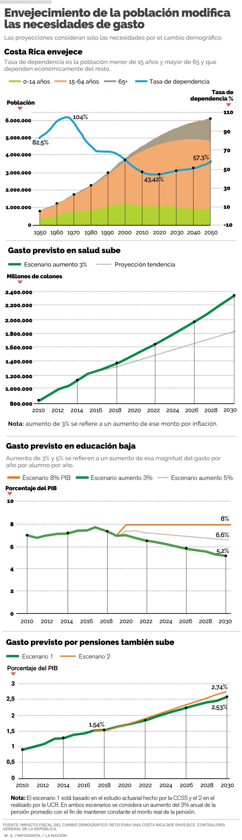Para el sector salud, el envejecimiento implica un aumento esperado del gasto en hospitalización y consulta externa de al menos el 86% (al pasar de ¢1.258.421 millones, en el 2016, a ¢2.340.763 millones en el 2030) debido a la mayor prevalencia de enfermedades no transmisibles (como diabetes, neoplasias como cáncer y enfermedades del corazón).