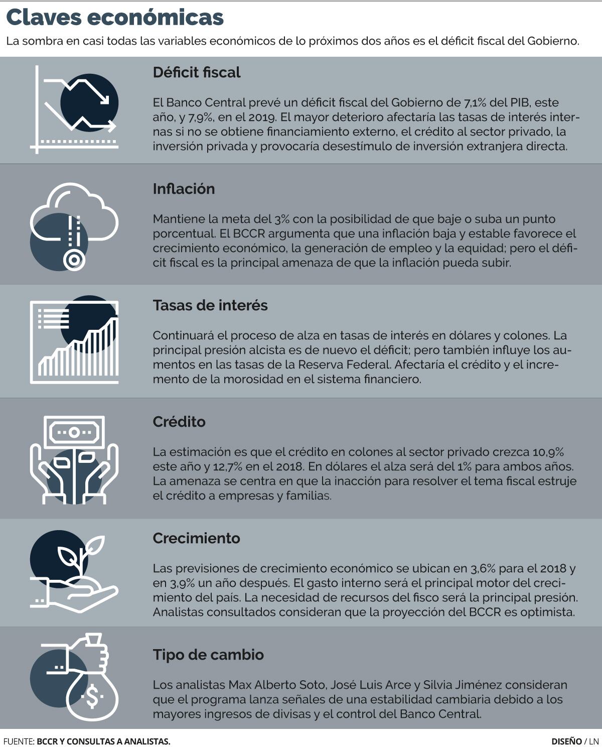 El Banco Central estima que el exceso de gastos totales sobre ingresos totales del Gobierno Central (déficit financiero) alcanzará un monto equivalente al 7,1% de la producción en el 2017 (cerca de ¢2,5 billones) y a 7,9% en el 2019 (cerca de ¢2,9 billones).