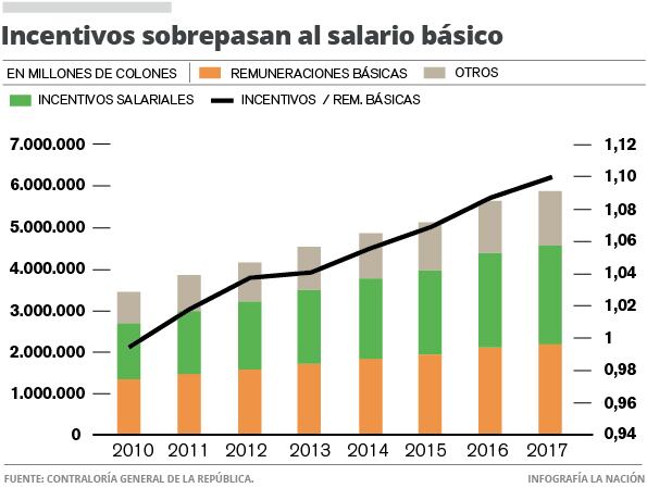 Por cada ¢1 de remuneración básica que prevé pagar el sector público este año, tiene previsto gastar ¢1,10 en incentivos salariales.