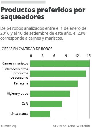 De 64 robos analizados por el OIJ, entre el 1 de enero del 2016 y el 10 de setiembre de este año, donde la mercadería fue identificada, casi una cuarta parte contenían carnes y mariscos. Le siguen los enlatados y otros productos alimenticios (22%), mientras que ocho (13%) guardaban café y cinco (8%) eran de línea blanca.