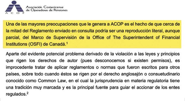 La Asociación Costarricense de Operadoras de Pensiones (ACOP) denunció un plagio de la Superintendencia de Pensiones (Supén) en la elaboración de un nuevo reglamento.
