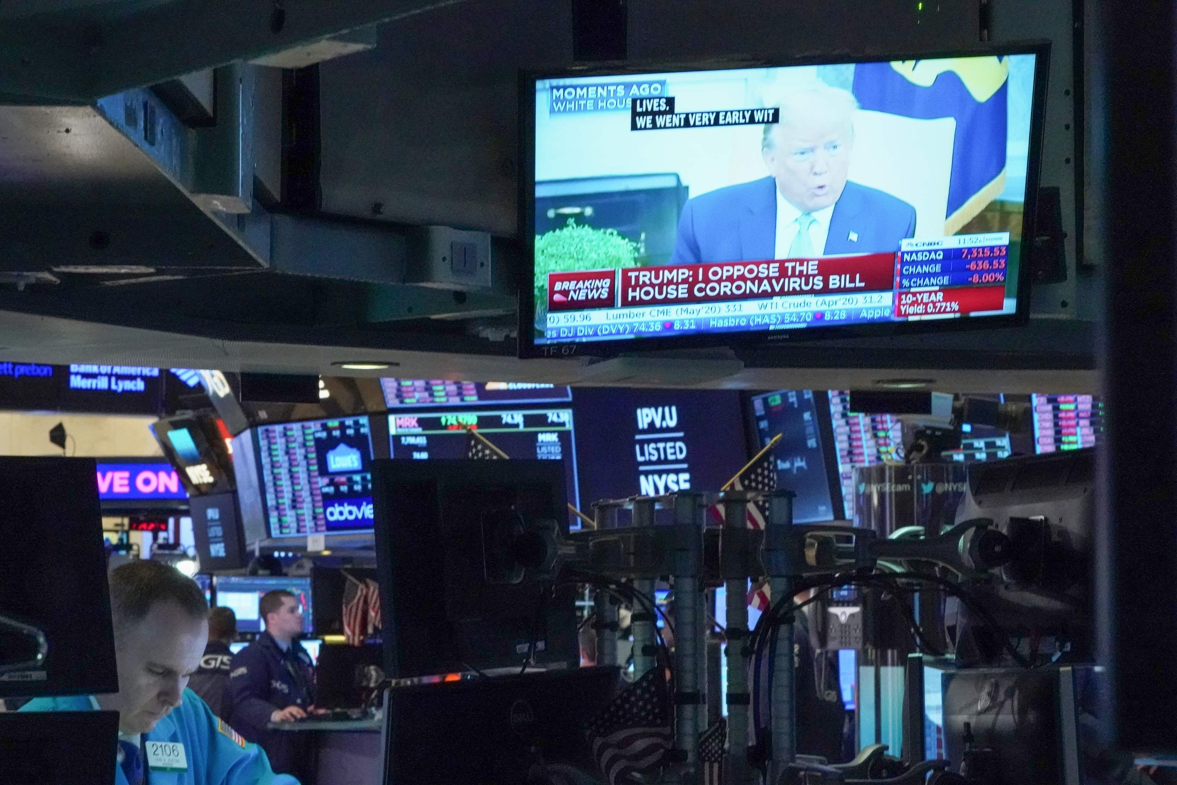 Estos anuncios permitieron a la bolsa de Nueva York recuperar algo de terreno a media jornada, con el Dow Jones en baja de 4,71%, luego de ceder más de 9%, mientras el tecnológico Nasdaq perdía 4,45%.