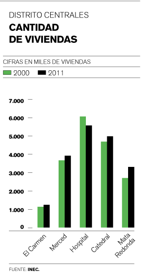 De hecho, según el Censo 2011, los distritos de El Carmen, Merced y Catedral tuvieron un incremento en el número de viviendas de casi un 10%, comparado con el estudio del 2000. En Mata Redonda, el aumento fue de un 22% durante el mismo periodo.