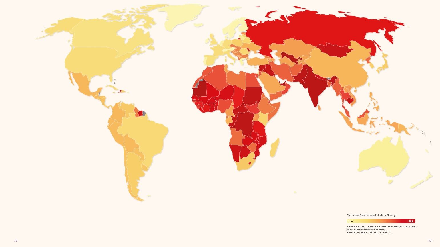 Según una investigación, llevada a cabo por la organización de defensa de los derechos humanos, "la esclavitud moderna está presente en los 167 países" en los que se realizó el estudio, pudiendo tratarse de trata de seres humanos, explotación sexual, trabajo forzoso, servidumbre por deuda o matrimonio forzoso.