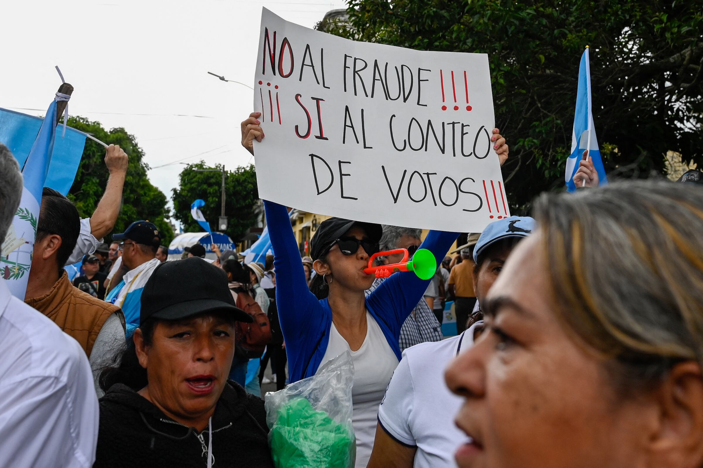 Unas 50 personas, algunas portando banderas de Guatemala, llegaron este domingo a la sede del TSE en la capital para exigir un nuevo conteo de votos.