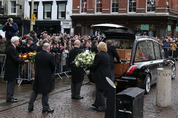 La familia pidió al personal de la Universidad de Cambridge llevar su ataúd, vestidos con el uniforme tradicional y bombín. El ataúd de roble estaba cubierto de lirios blancos y rosas blancas que representan el universo y la estrella polar. A su llegada, la campana de la iglesia sonó 76 veces, uno por cada año de vida de Hawking .