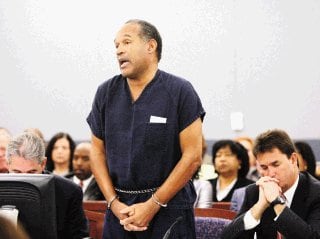 Con la mirada gacha y esposado, O.J. Simpson escuchó las sentencias por cada uno de los cargos presentados en su contra por este caso de robo a mano armada de recuerdos deportivos en el 2007 en un hotel-casino de Las Vegas (Nevada, oeste).