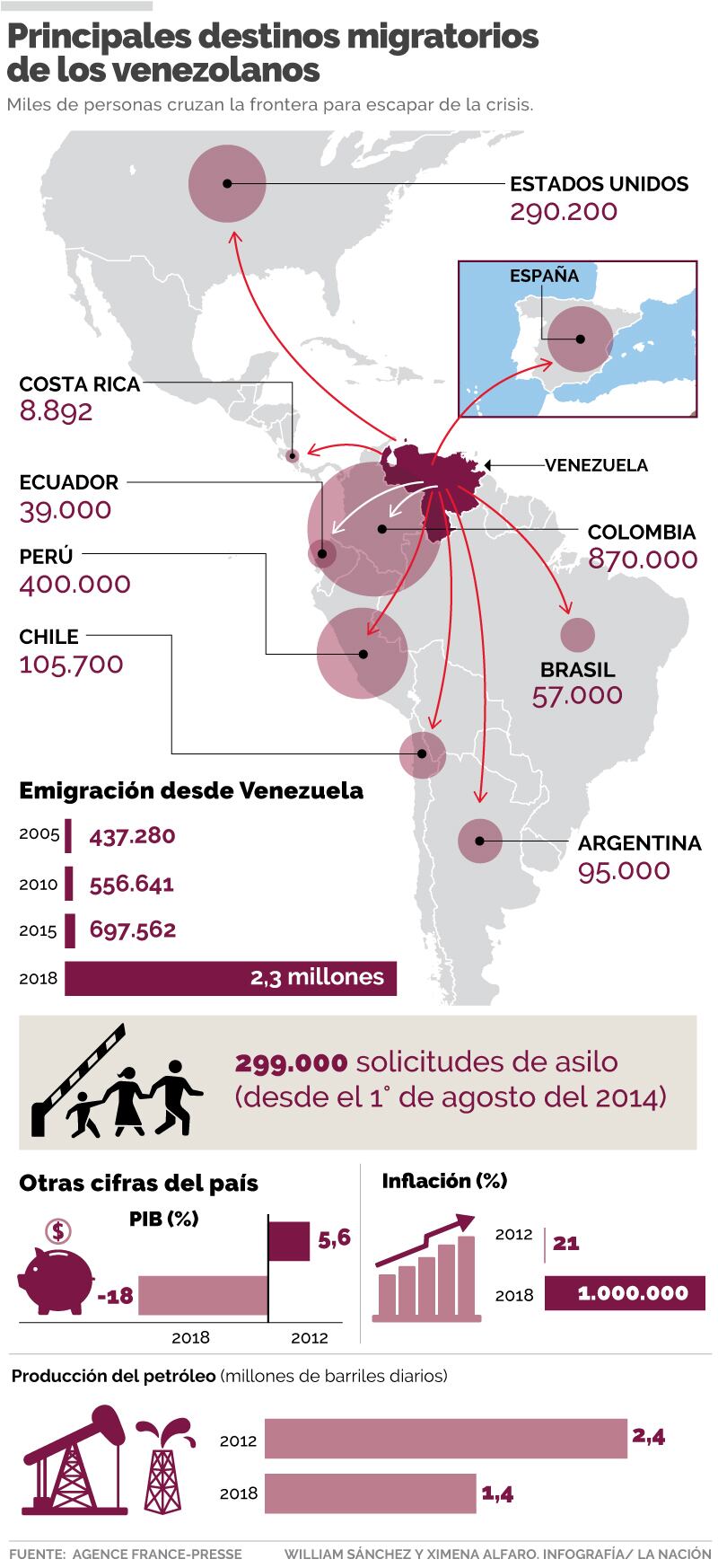 Venezuela, que se había caracterizado por ser un país destino, empezó desde el 2010 a convertirse en un territorio expulsor de población. A partir del 2010, el flujo de venezolanos aumentó hacia Estados Unidos, Colombia y Perú. Según los datos de la ONU, 2,3 millones de venezolanos (7,5% de la población de 30,6 millones) han abandonado el país desde el 2014, de los cuales 1,6 millones salió a partir del 2015.