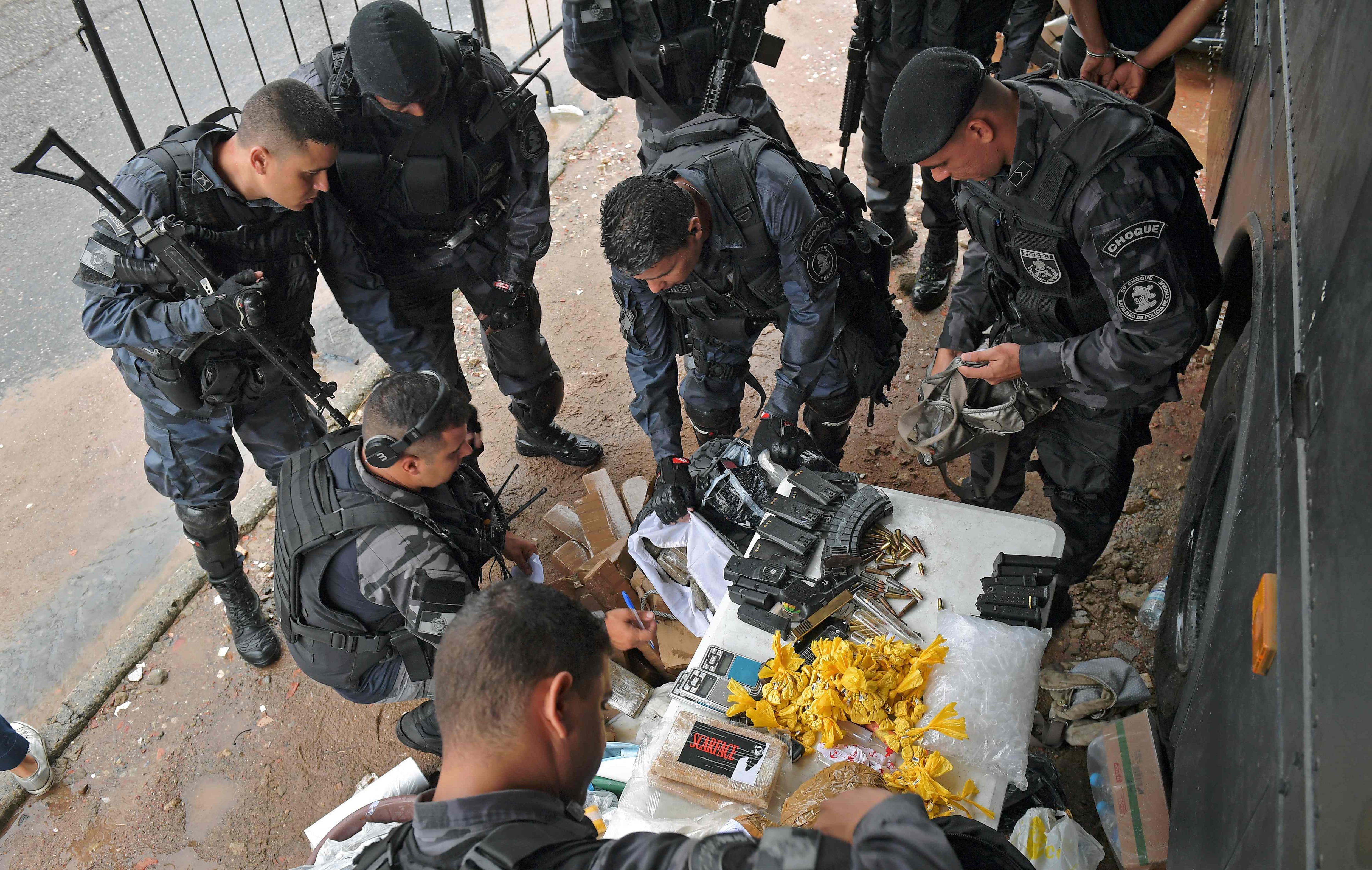 En una calle adyacente a Vila Aliança, sobre la mesa de un puesto de la Policía Militar (que depende de la autoridad de cada Estado) varios agentes efectuaban el recuento del material decomisado: pistolas, cargadores, barras de marihuana prensada, bolsitas de cocaína, bolsas con otras drogas y dos barras de dinamita, comprobó un periodista de la AFP.