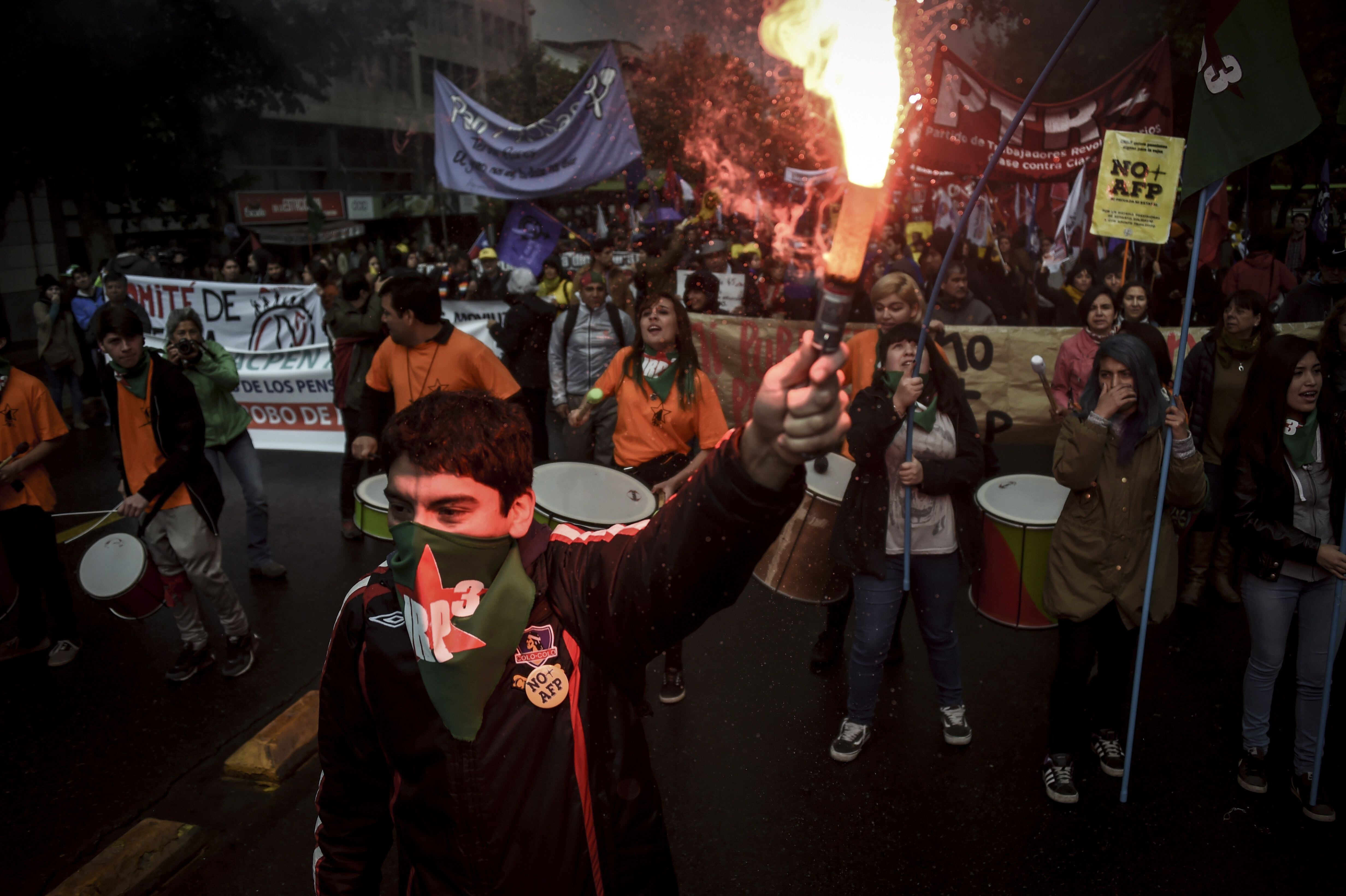 Los manifestantes, unos 75.000 -según los organizadores de la protesta- y 15.000 -de acuerdo a la Policía-, marcharon por el centro de Santiago para reclamar contra este sistema controlado por las Administradoras de Fondos de Pensiones (AFP). Estas constituyen empresas privadas que son el blanco de las críticas por las modestas pensiones que pagan, en contraste con las suculentas ganancias que obtienen.