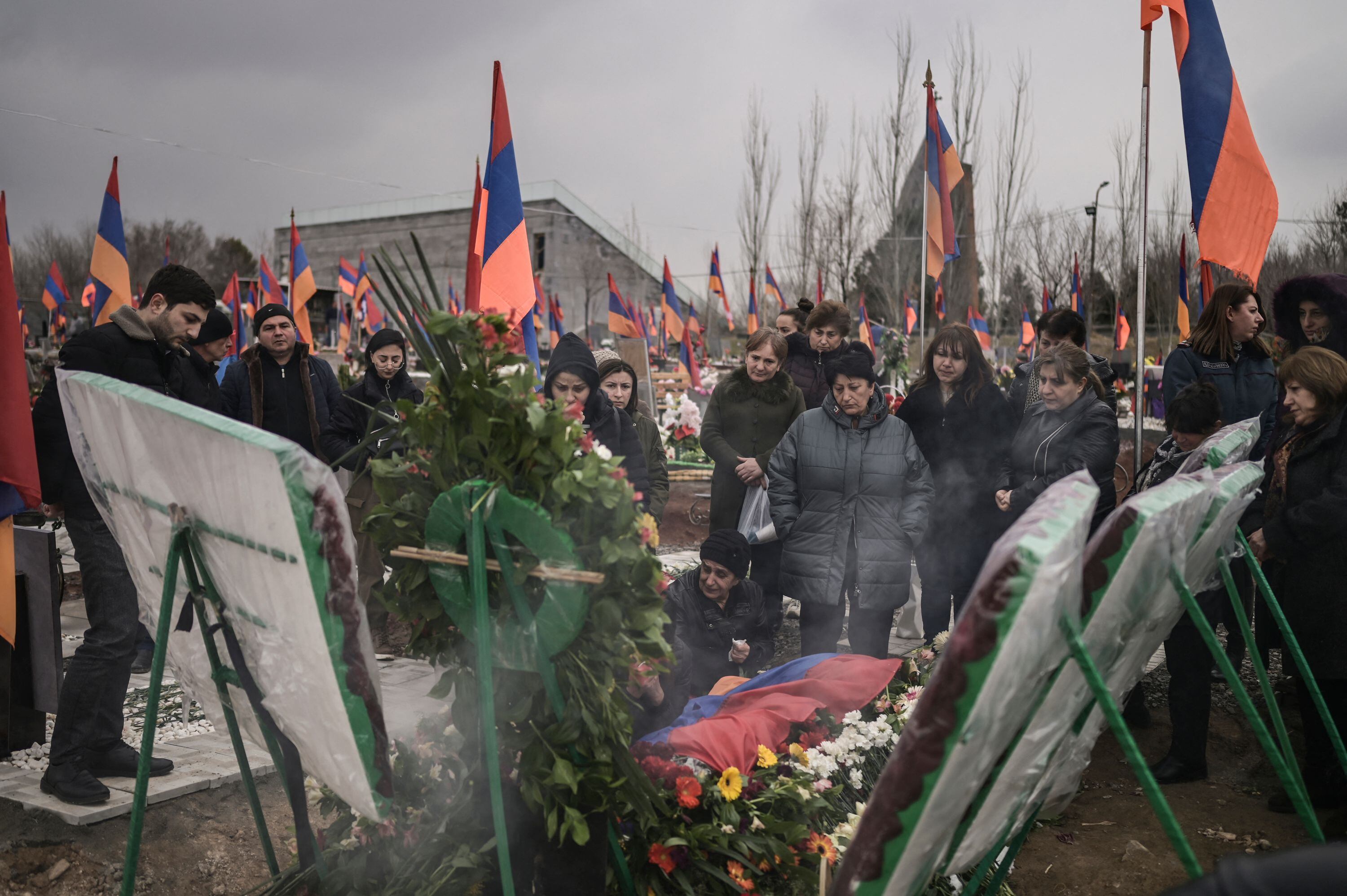 Hadrut, Azerbaiyán. A 200 kilómetros de su tierra, allegados, amigos y vecinos de Arman Sarkisian, fallecido hace tres meses en Nagorno Karabaj, se congregan en un cementerio militar de Ereván para un último adiós, dos días después que sus padres identificaron su cuerpo.