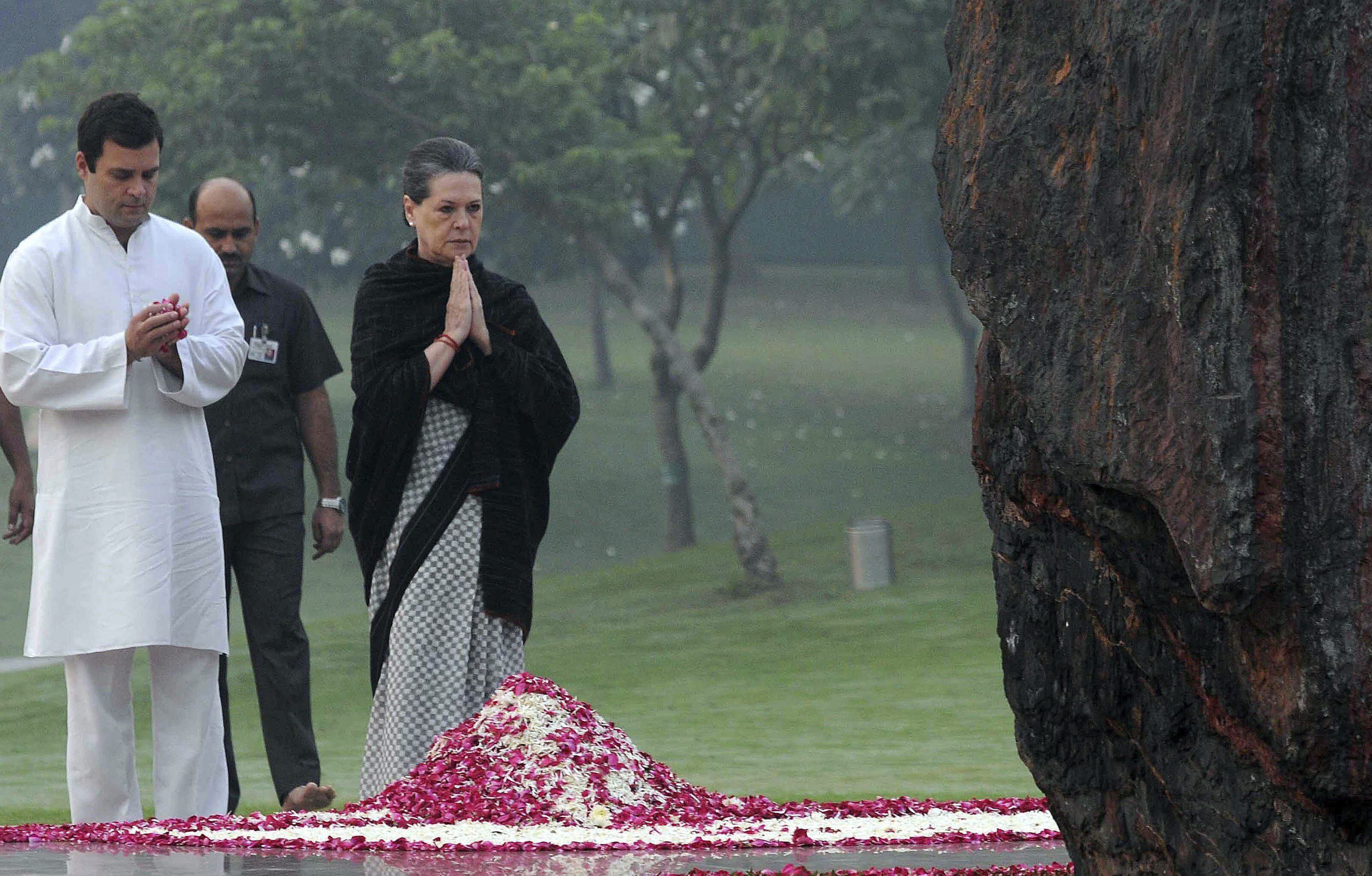 Sonia y Rahul, que condujeron al partido a su peor derrota de la historia en las elecciones de mayo pasado, unieron sus palmas en el gesto tradicional indio frente al memorial de Indira.