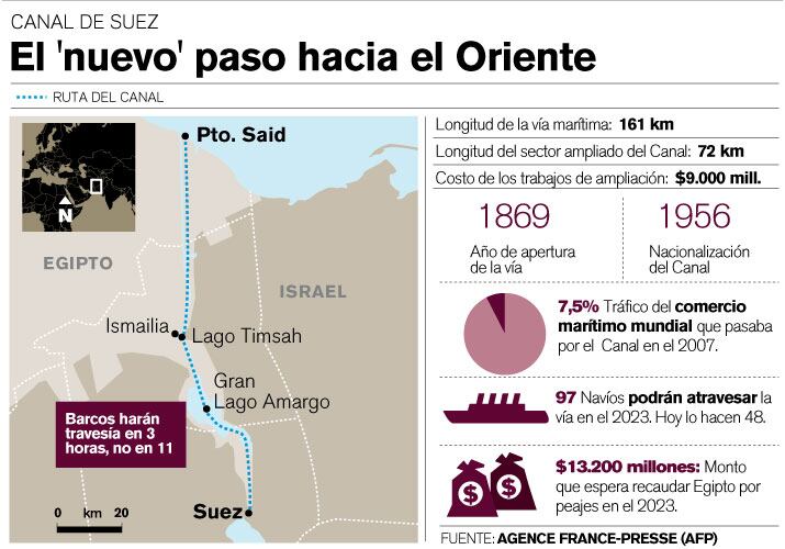 La inauguración, con el presidente francés, François Hollande, como invitado de honor, y con la presencia de varios jefes de Estado, será en Ismailia (noreste), junto al Canal.