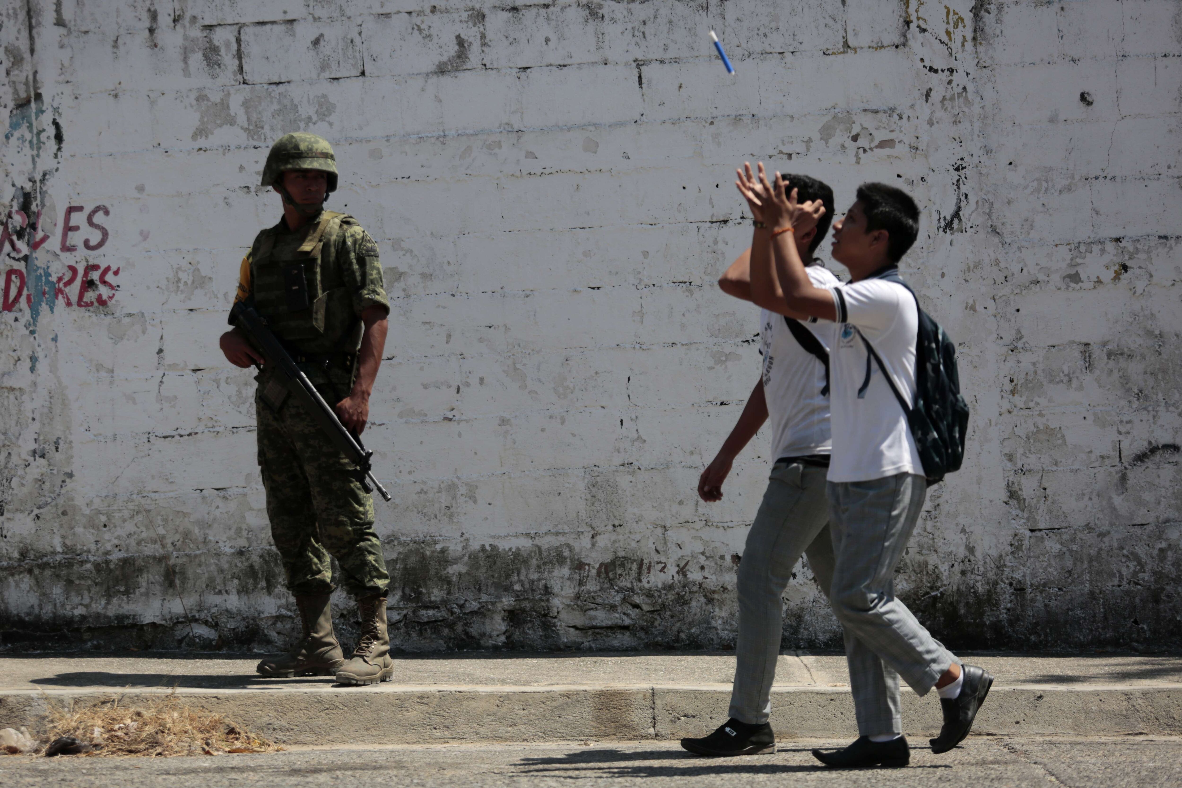 El ejército llegó hace tres semanas a más de 100 escuelas de la periferia de este puerto sobre el océano Pacífico (a unos 370 kilómetros al sur de Ciudad de México) para frenar la irrupción de asesinatos, secuestros y extorsiones contra profesores.