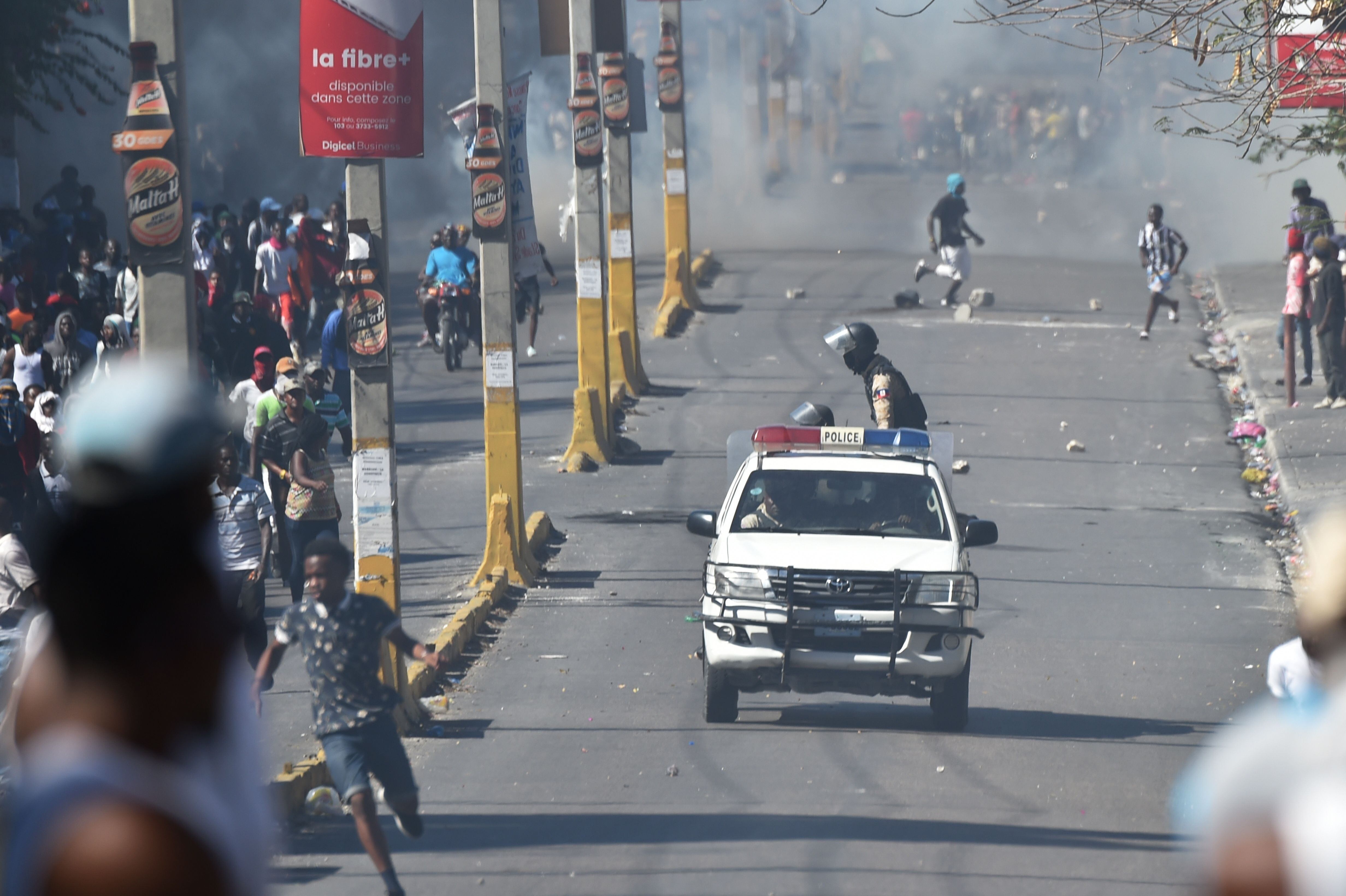 Después de un tranquilo pero tenso comienzo de día, cientos de jóvenes de los barrios más pobres de la capital marcharon hacia Petionville, la zona más rica de Puerto Príncipe, arrojando piedras a las casas hasta que la policía lanzó gases lacrimógenos para detenerlos.