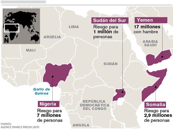 Somalia, Sudán del Sur, Yemen y Nigeria están afectados por una grave sequía y, además, son presa de la violencia o de conflictos armados. Naciones Unidas reclama a la comunidad internacional $4.400 millones para hacer frente a la hambruna que amenaza a estos países.