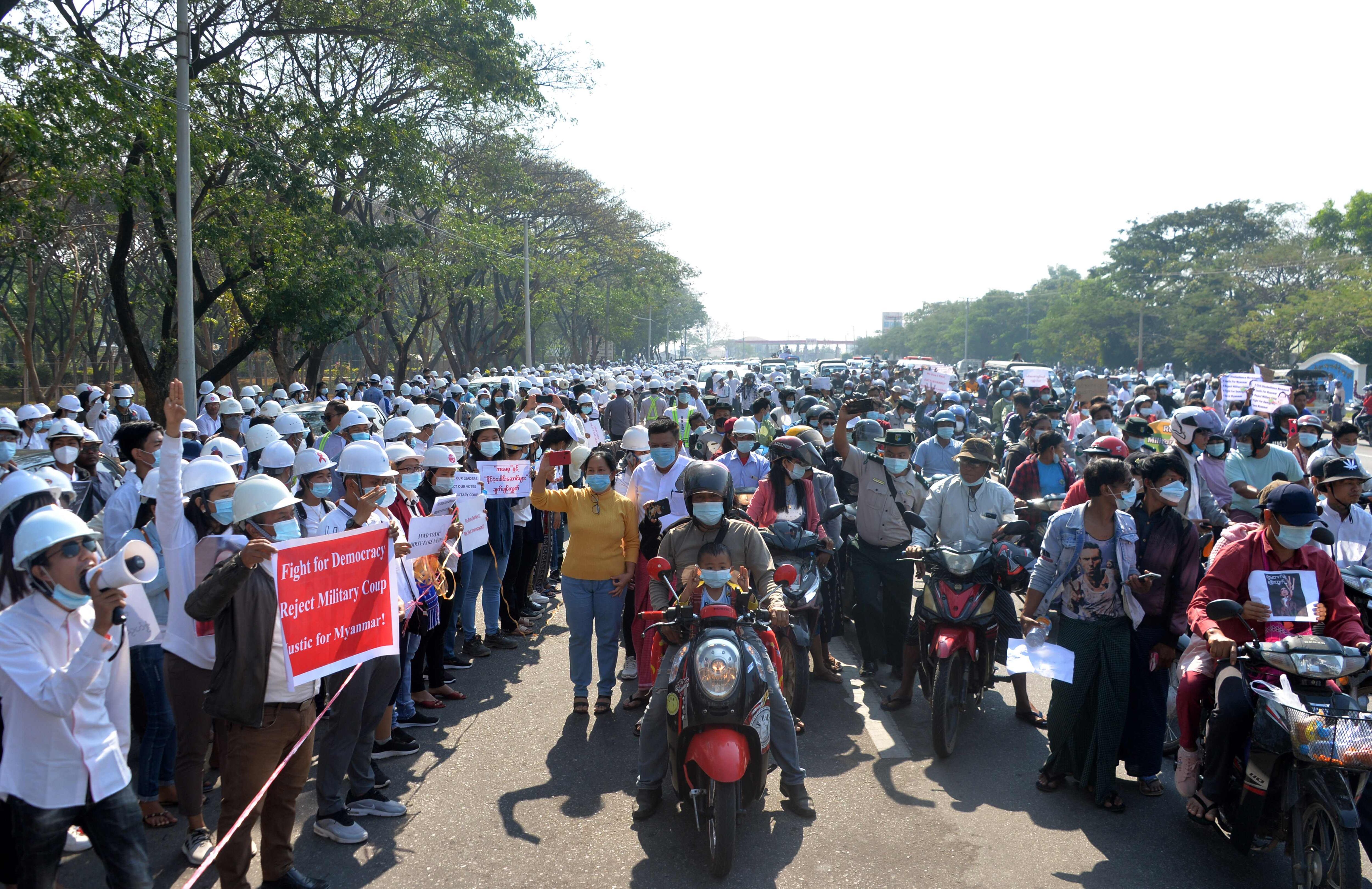 “Nos manifestaremos hasta que Aung San Suu Kyi y Win Myint (expresidente de la República) sean liberados”, declaró un empleado del banco.