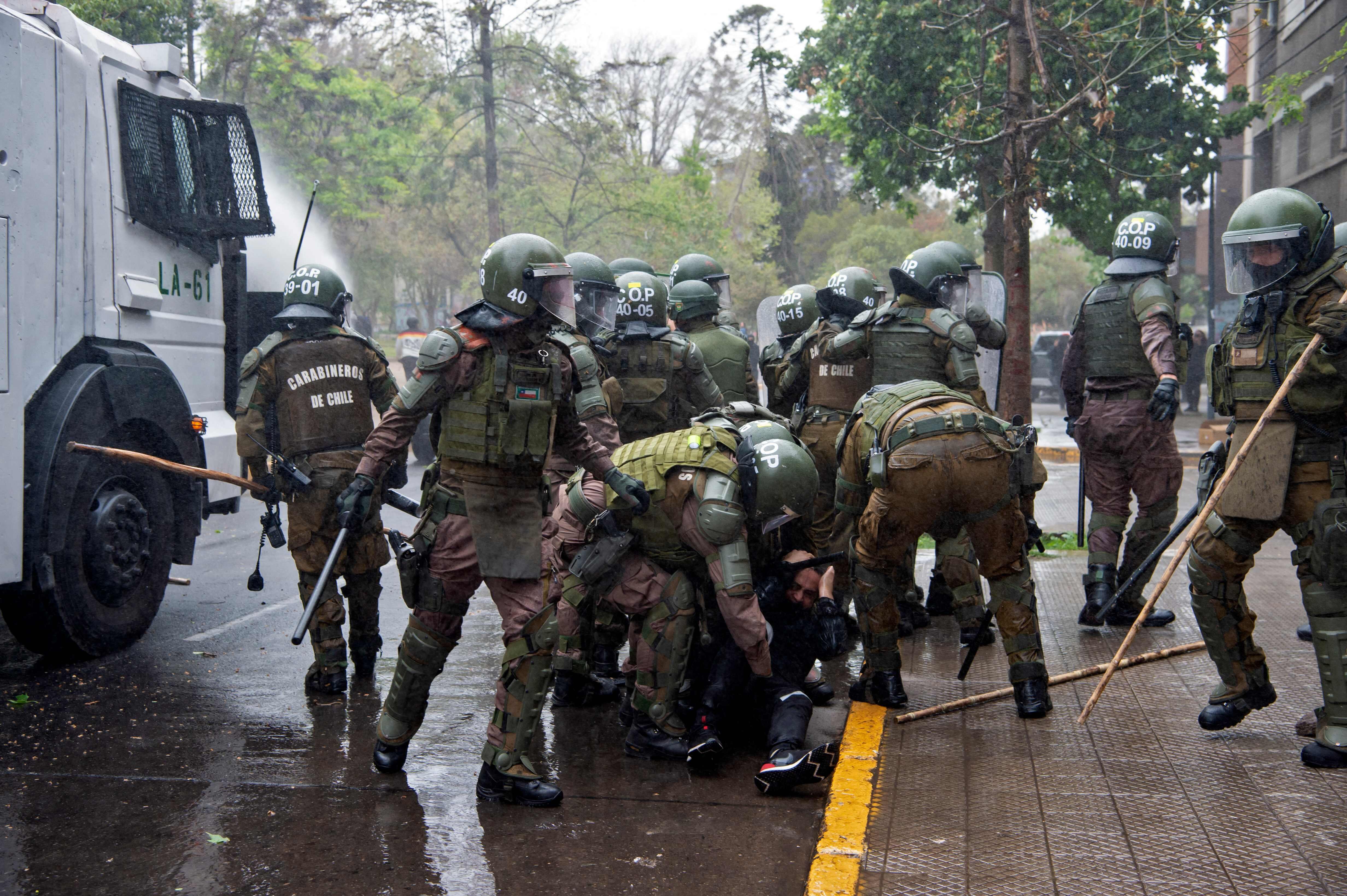 Cuando la marcha se movilizaba hacia la Alameda, principal avenida de Santiago, la Policía chilena dispersó la protesta con un fuerte contingente de efectivos apoyados con carros lanza-agua y gases.
