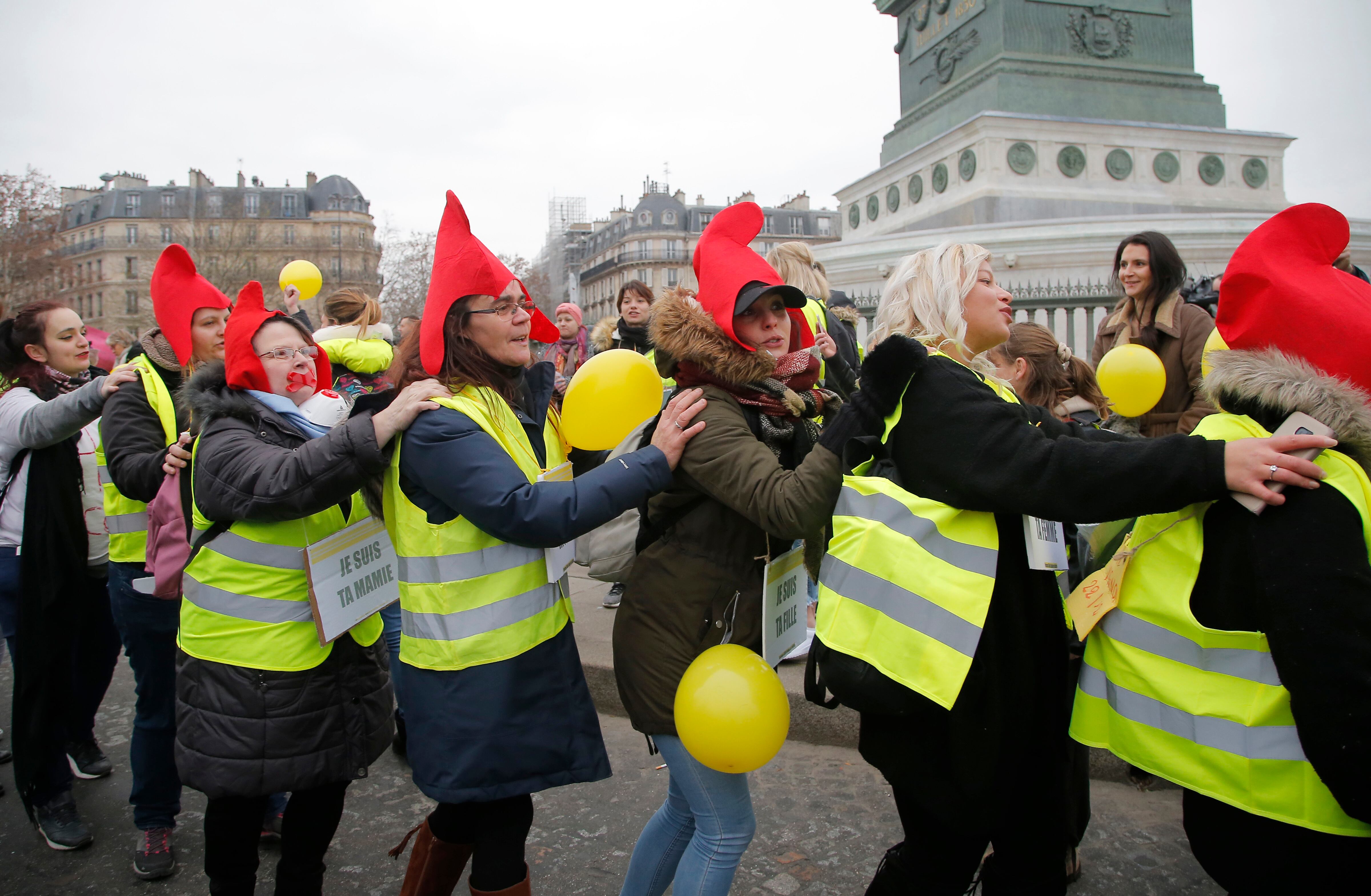 En París, las mujeres se reunieron en la mañana de este domingo en la plaza de la Bastilla y en la plaza de la República vestidas con gorros frigios y portando globos amarillos.